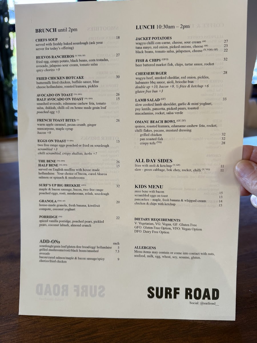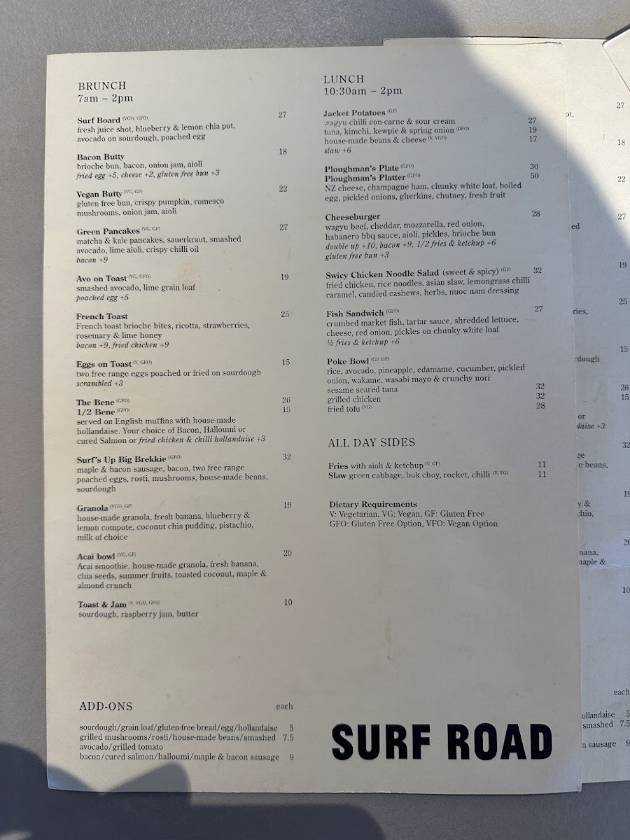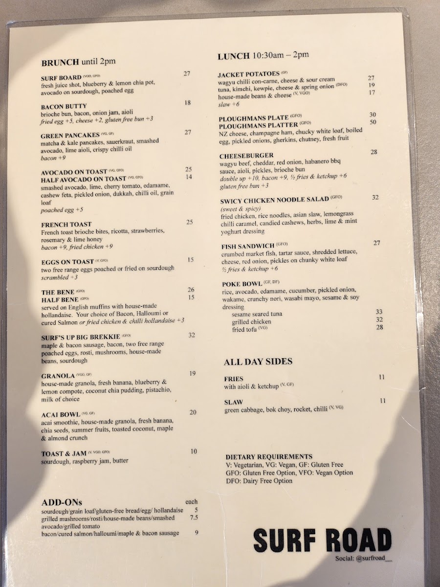 The menu at SURF ROAD offers a diverse selection of food and beverages suitable for various mealtimes, including breakfast, lunch, and coffee breaks. It is designed to accommodate visitors seeking both lighter options and fuller meals in a casual dining setting.