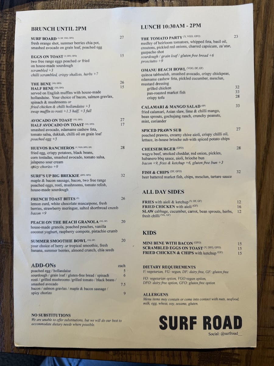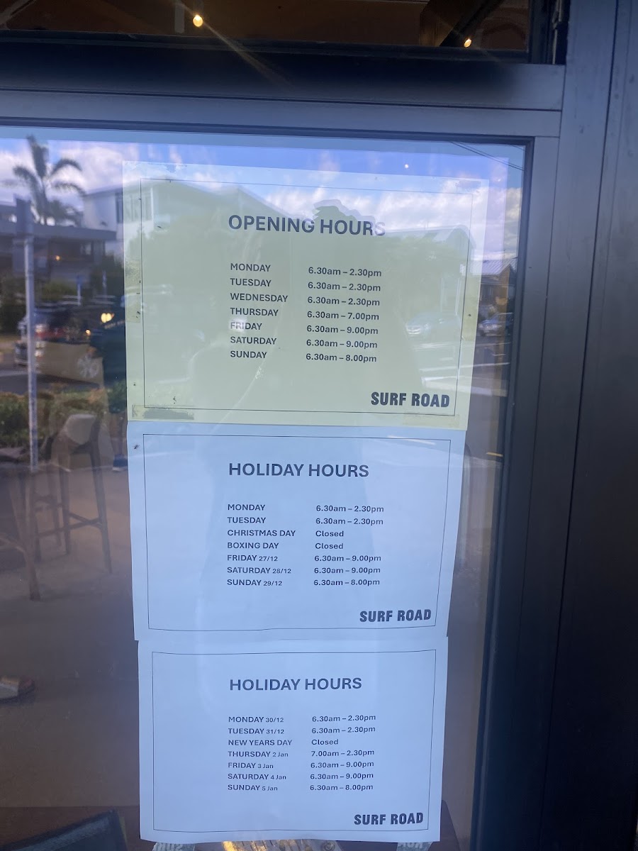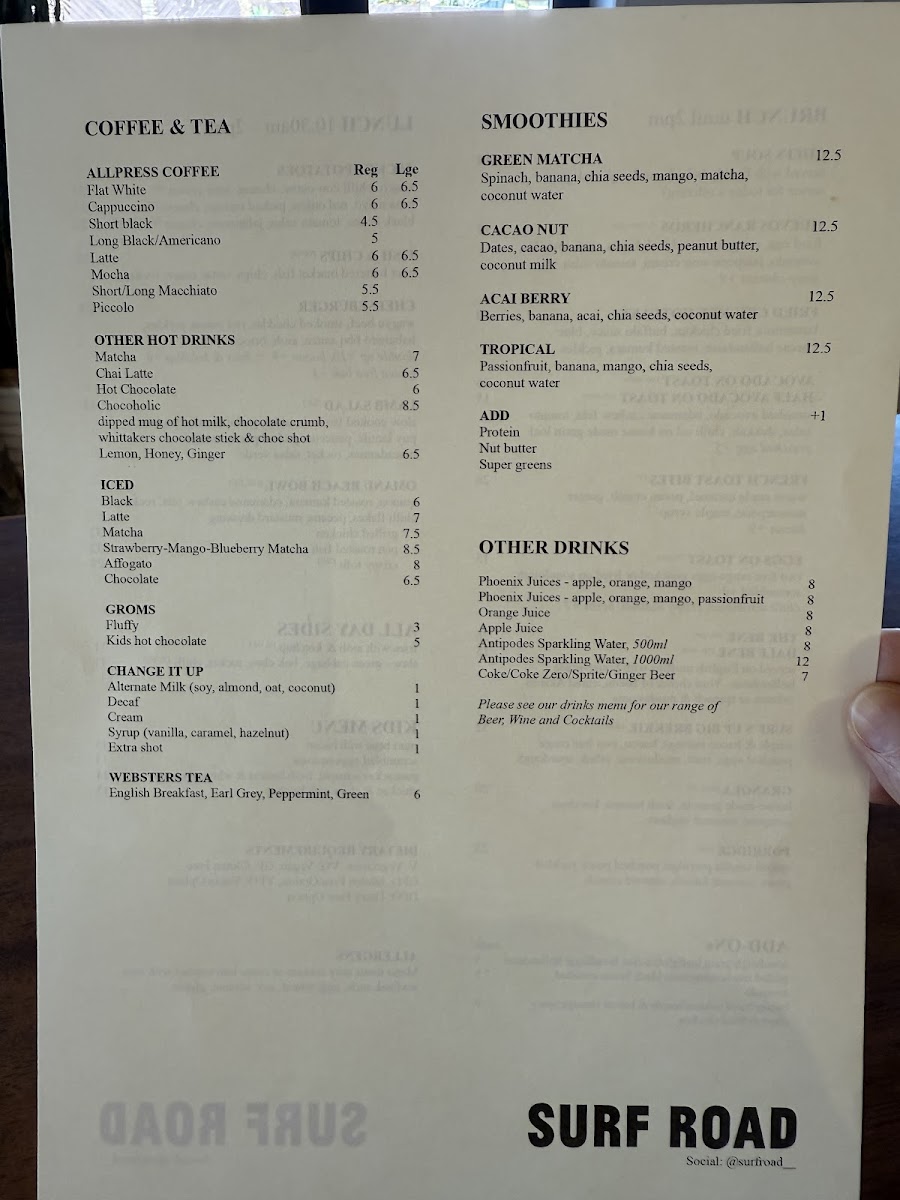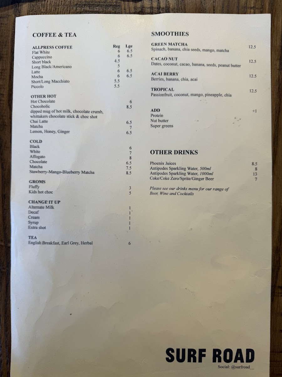 The menu at SURF ROAD offers a diverse selection of food and beverages suitable for various mealtimes, including breakfast, lunch, and coffee breaks. It is designed to accommodate visitors seeking both lighter options and fuller meals in a casual dining setting.